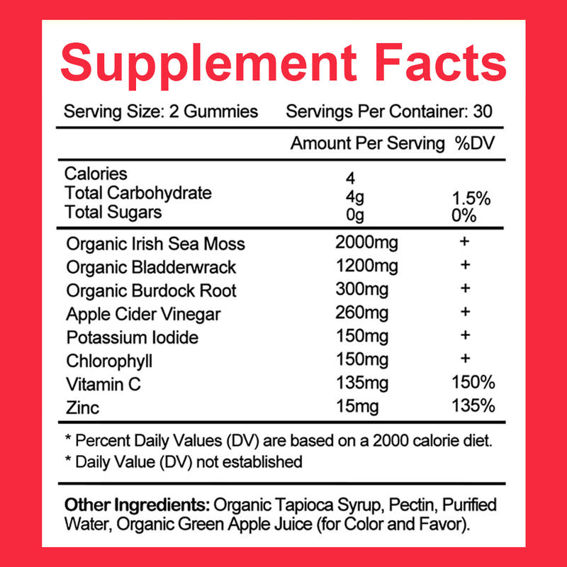 Organik İrlanda Denizi Moss, C Vitamini, Çinko, Organik Mesane Kökü, Organik Burdock Kökü, Elma Baharı Asit, Potasyum Yodür, Klorofil