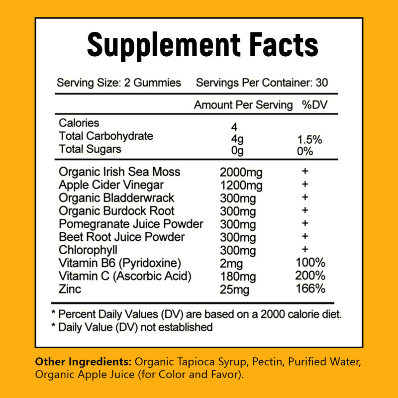Organik İrlanda Deniz Yosunu, Organik Bladderwrack, Organik Dulavratotu Kökü, Elma Sirkesi, Nar Suyu Tozu, Pancar Kökü Suyu Tozu, Çinko, B6 Vitamini, C Vitamini, Klorofil
