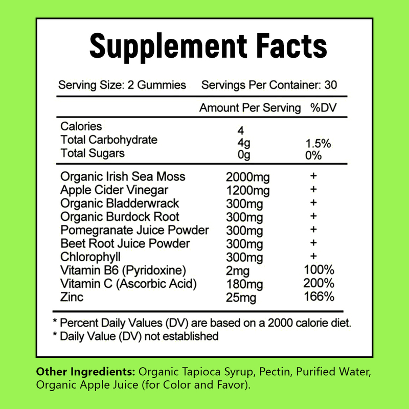 Organik İrlanda Deniz Yosunu, Organik Bladderwrack, Organik Dulavratotu Kökü, Elma Sirkesi, Nar Suyu Tozu, Pancar Kökü Suyu Tozu, Çinko, B6 Vitamini, C Vitamini, Klorofil