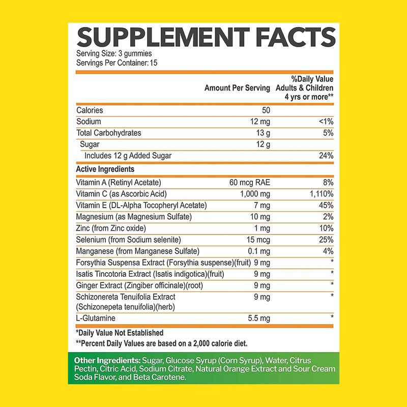 C Vitamini, A Vitamini, E Vitamini, Çinko, Magnezyum, Selenyum, Manganez, Zencefil Özü, Forsythia Suspensa Özü, Isatis Tincotoria Özü, Schizonereta Tenuifolia Özü, L-Glutamin